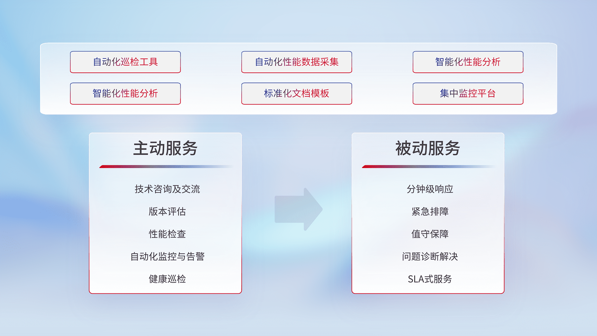 智能化工具和标准化文档,,,保障服务质量,,,,提供主动服务(包含技术咨询、、、、版本评估、、、、性能检查、、、自动化监控与告警、、健康巡检)和被动服务包含(分钟级响应、、、、紧急排障、、、值守保障、、问题诊断解决、、SLA服务)。。。。